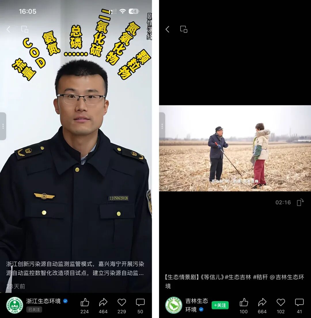 “浙江生态环境”聚焦执法模式创新,以“智慧监管”为主线,通过“多次敲门汇报”的重复情节制造喜剧张力,用传统人工巡查和AI监管对比,直观呈现数据直传、远程巡查等“科技狠活”,既展现了执法效率的提升,又深化了数智监管为企业减负的重要意义。