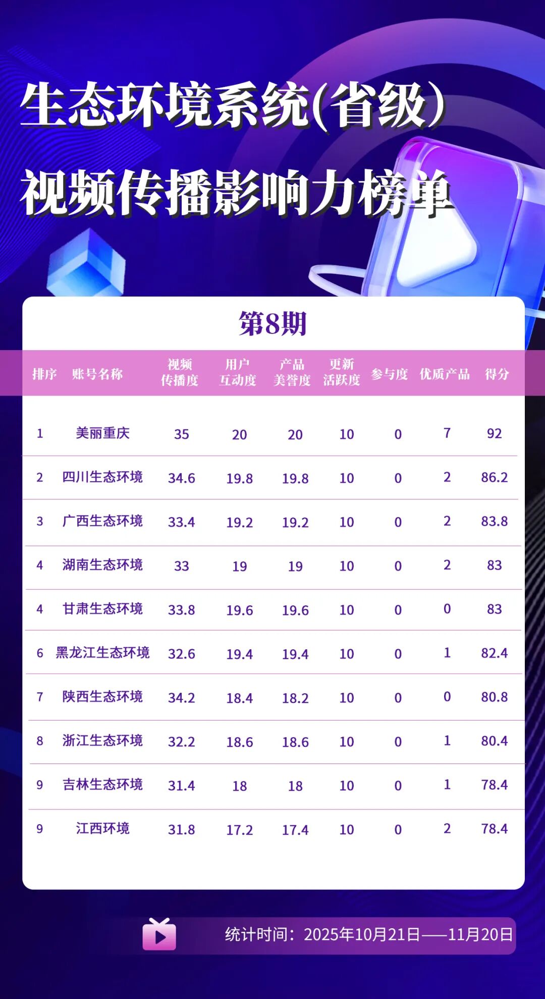 为进一步推动生态环境系统提升短视频制作和运营水平,鼓励地方用好短视频宣传的传播方式,不断产出高质量、有影响力的短视频作品,中国环境报社、中国环境客户端日前发布了生态环境系统(省级)视频号传播影响力榜单。11月优质作品来自重庆、广西、湖南、吉林、四川、浙江、黑龙江、江西8个省(自治区、直辖市)。
