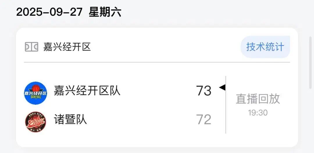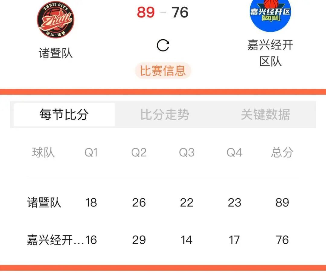 本场比赛后,诸暨队的战绩为12胜5负积29分,嘉兴经开区队的战绩为4胜12负积20分。