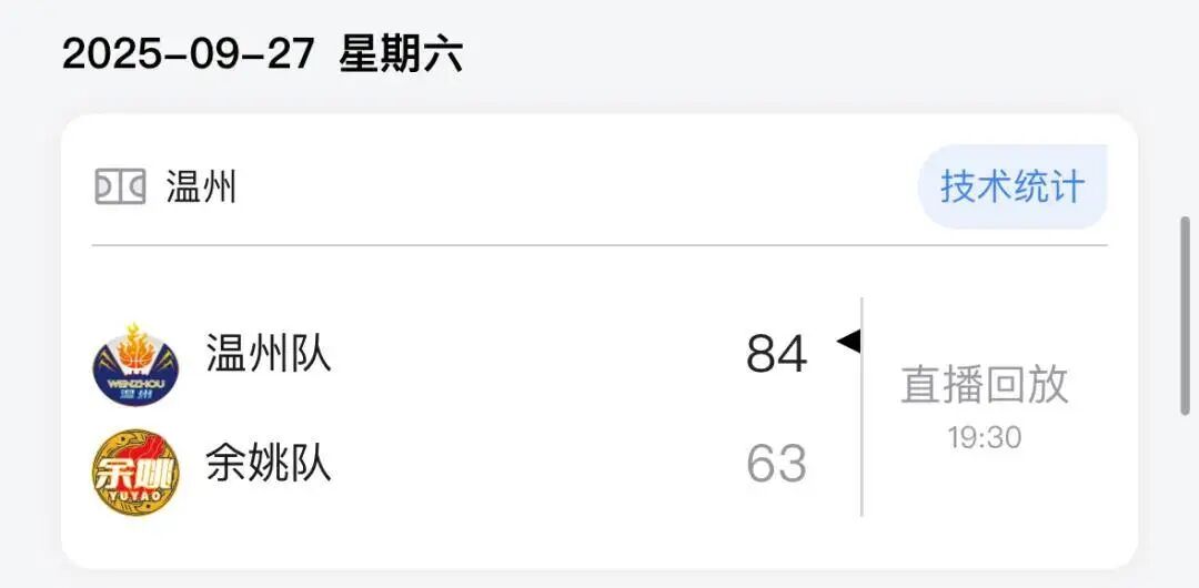 本场比赛后,余姚队的战绩为9胜8负积26分,温州队的战绩为16胜0负积32分。