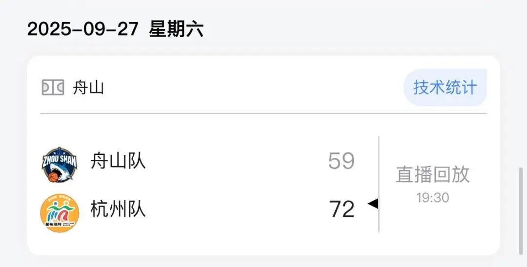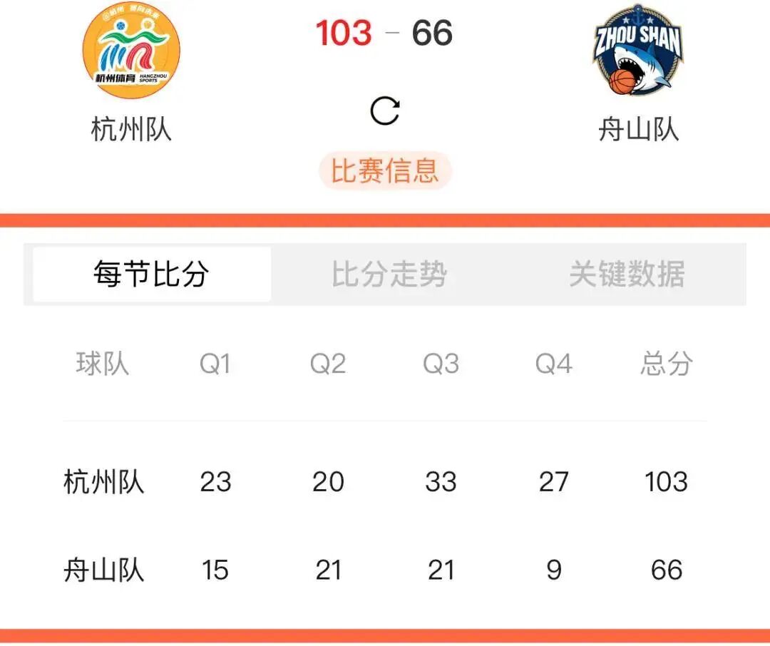 本场比赛后,杭州队的战绩为15胜1负积31分,舟山队的战绩为4胜12负积20分。