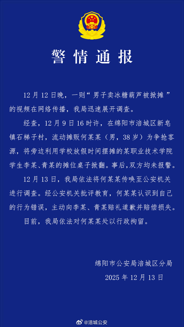 12月12日晚,一则“男子卖冰糖葫芦被掀摊”的视频在网络传播,我局迅速展开调查。