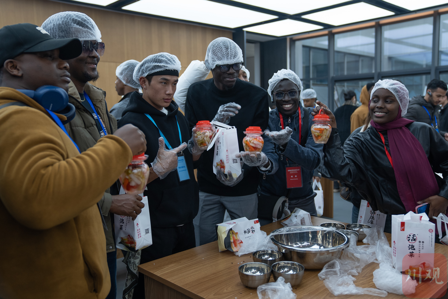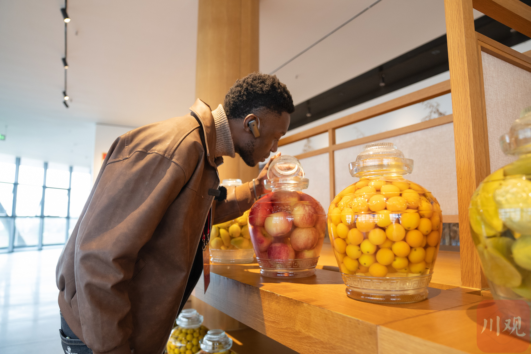 在四川老坛子食品有限公司的泡菜展区,四川农业大学加蓬留学生李安德兴奋地揭开泡菜坛盖,这里不仅有传统的泡萝卜、泡豇豆,还有各类水果泡菜,“非常奇妙,我在四川留学6年了,第一次见到泡菜是怎么做出来的。”李安德和同伴们还戴上手套,亲自体验了跳水泡菜的制作,感受川味美食背后的产业力量。