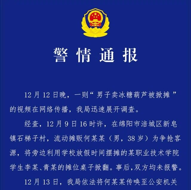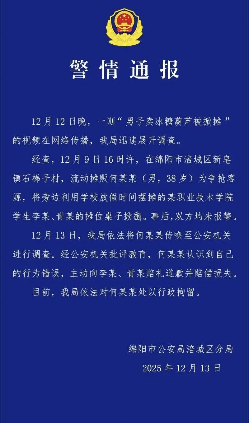 绵阳市公安局涪城区分局发布通报称,12月12日晚,一则“男子卖冰糖葫芦被掀摊”的视频在网络传播,该局迅速展开调查。经查,12月9日16时许,在绵阳市涪城区新皂镇石梯子村,流动摊贩何某某(男,38岁)为争抢客源,将旁边利用学校放假时间摆摊的某职业技术学院学生李某、青某的摊位桌子掀翻。事后,双方均未报警。