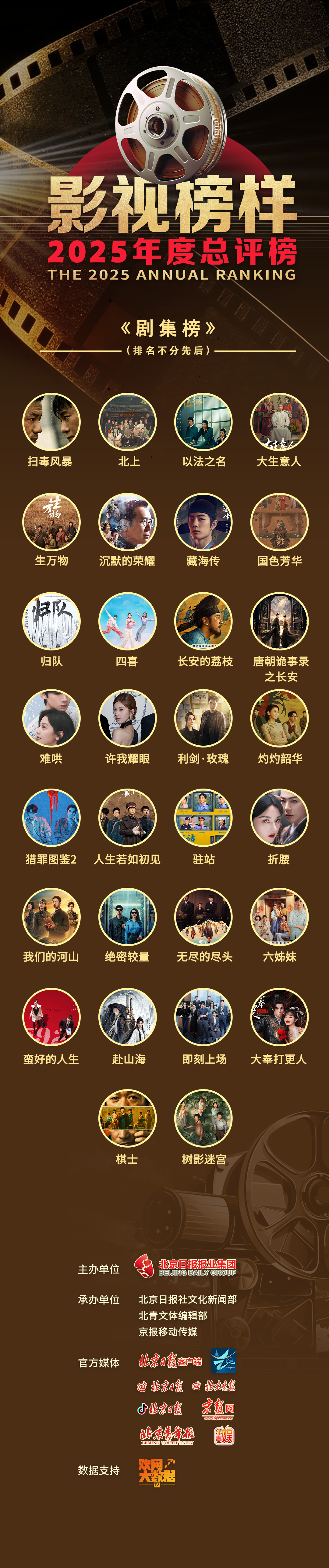 截至12月1日,累计收到2025年度重点影视剧、综艺节目近200部,经过组委会内部初选,从剧集、综艺两大门类中,分别选出前30名作品入围“影视榜样·2025年度总评榜”初选榜单。