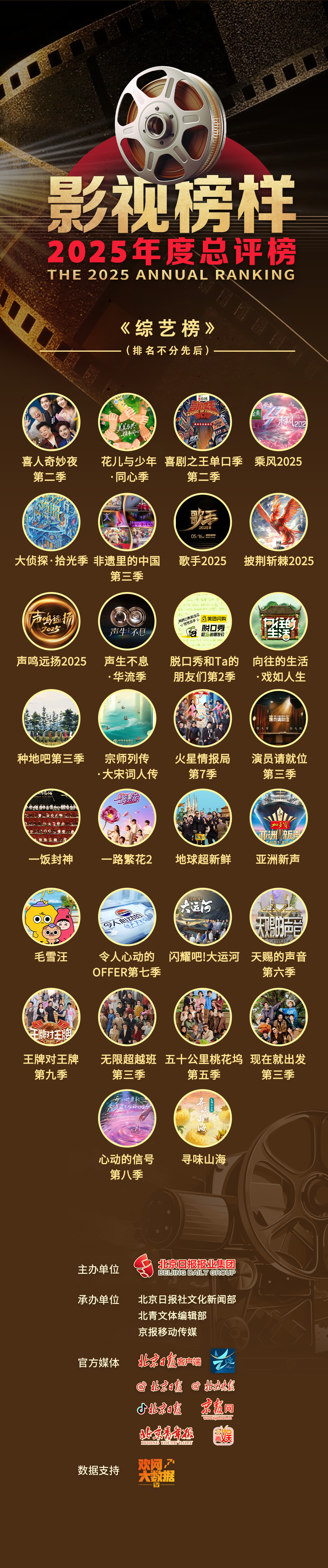 综艺方面,今年“综N代”依然强势占据收视榜单前列,《歌手2025》《王牌对王牌第九季》《现在就出发第三季》均表现突出;《喜人奇妙夜》《脱口秀和Ta的朋友们》等喜剧综艺到了第二年也依然表现强势,出产了不少经典名场面;《亚洲新声》《声鸣远扬》《地球超新鲜》《一饭封神》等综艺上新,展示了国产综艺的创新力度,而文化类综艺《闪耀吧!大运河》《宗师列传·大宋词人传》和《寻味山海》的出现,也彰显着综艺品类的多样性。