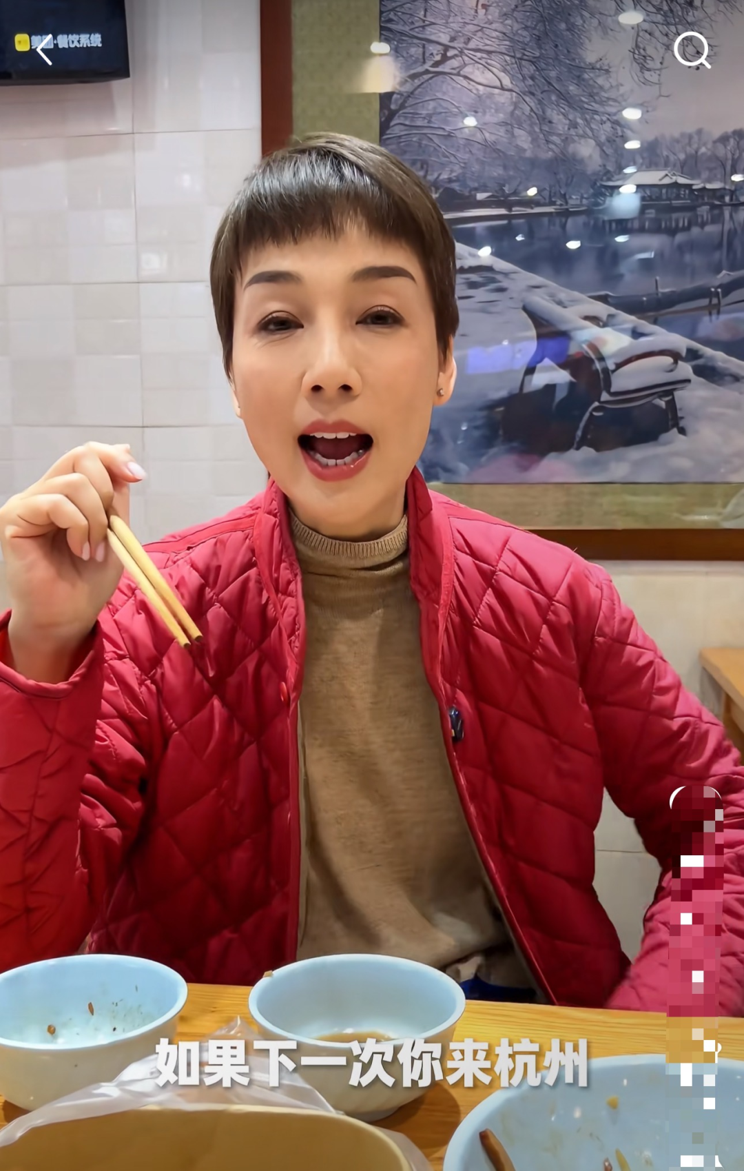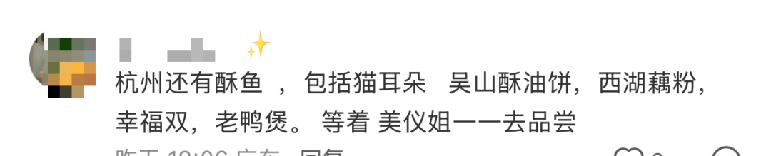 在视频的最后,她也对着粉丝喊话:如果你下一次来杭州,一定要过来美食街,这里有很多不同的美食。