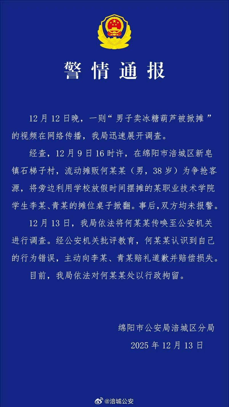 12月12日晚,一则“男子卖冰糖葫芦被掀摊”的视频在网络传播,该局迅速展开调查。