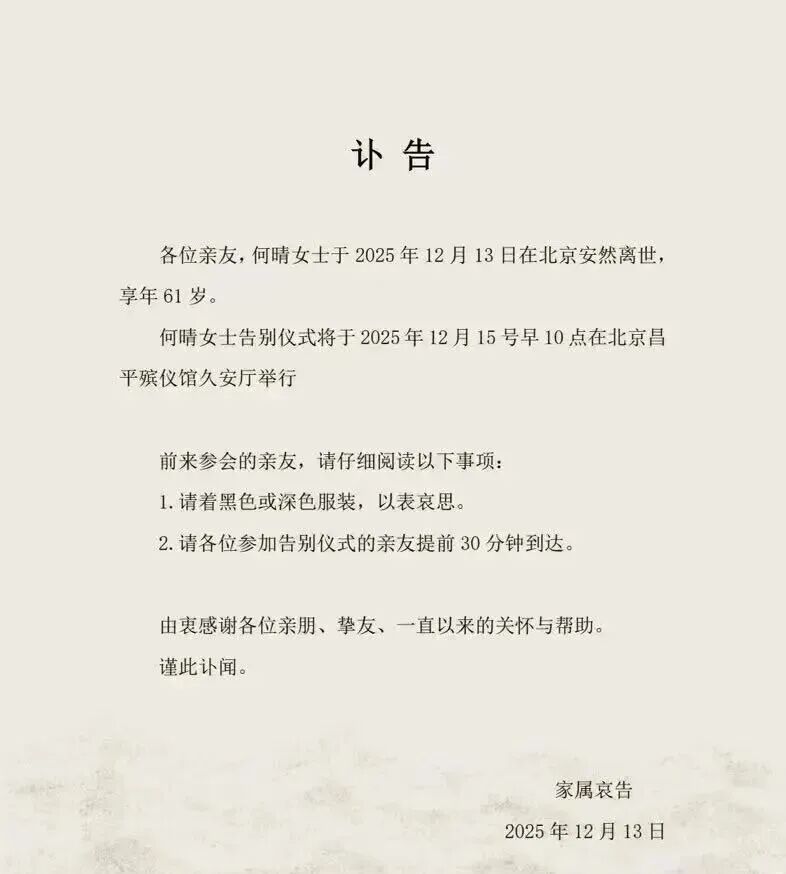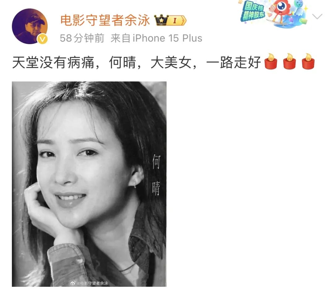 微博用户“电影守望者余泳”于社交平台发布何晴的黑白肖像照,并配文“天堂没有病痛,何晴,大美女,一路走好”,引发网友与演艺圈人士的集体缅怀。余泳透露,何晴生病后一直希望低调,让大家永远记住她美好的形象。