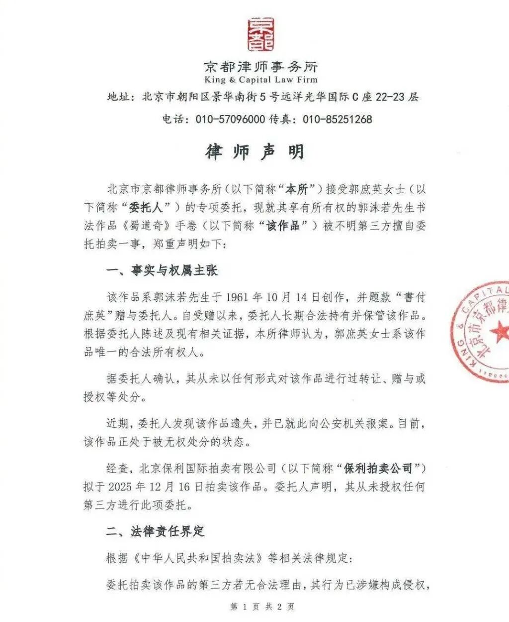 近日,郭沫若书法手卷《蜀道奇》将亮相北京保利二十周年秋拍,12月16日开拍,起拍价800万元。其女郭庶英委托律师发布声明,称该作品为父亲1961年题赠自己的私藏,从未转让或授权,目前已遗失并报警,质疑拍卖为无权处分,要求保利中止拍卖、返还作品。