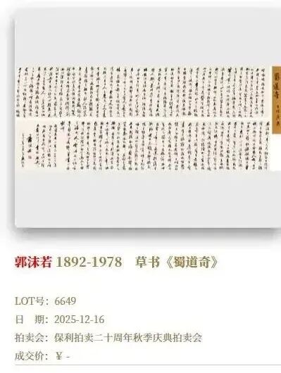 记者查询发现,截至12月12日,保利拍卖官网仍未撤下该拍品,其信息显示作品 “传承有序、原装原裱”,为郭沫若自作诗手卷,在拍卖市场极为罕见。郭庶英方面透露,曾与保利沟通但遭拒绝,对方坚持委托人有权处分。据业内人士介绍,拍卖行业多依托委托方提供的来源信息,仅做形式审查,遵循 “声明不保证权属” 惯例,若委托方隐瞒实情,拍卖方难避风险。