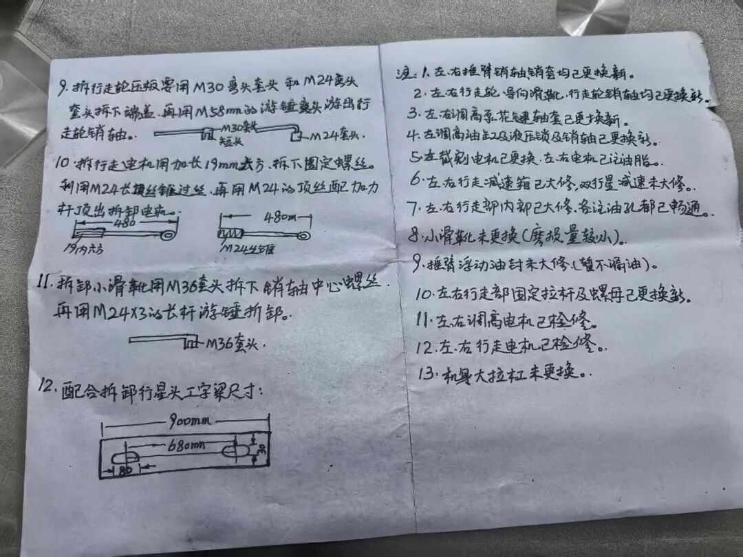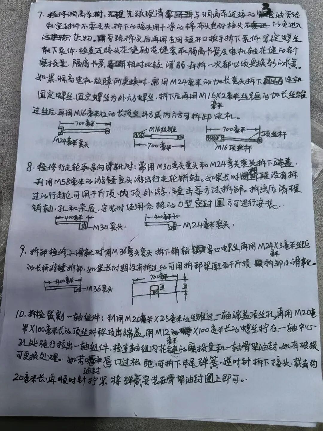 临近退休的日子,他几乎把所有时间都投入手册的编写中。稿纸上画满密密麻麻的草图,采煤机型号、拆卸顺序、工具尺寸,标注得一清二楚。