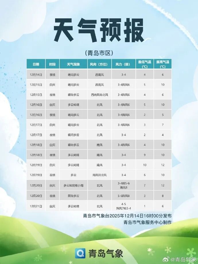 【青岛市区】今天夜间,晴间多云,西南风3到4级。明天白天,晴间多云,西南风3到4级阵风6级,相对湿度40%-80%。明天最低气温4℃,最高气温10℃。