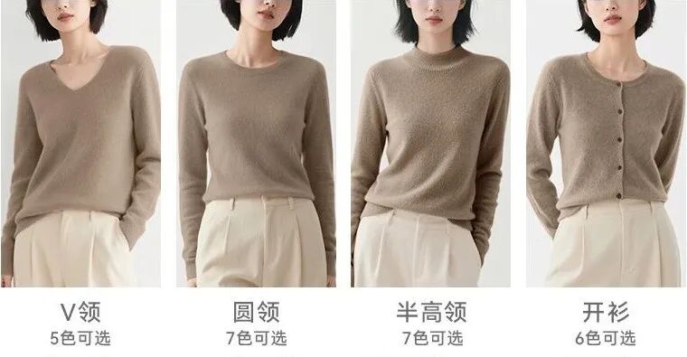 女款羊毛衫有四种款式可选,圆领、半高领、V领、开衫。