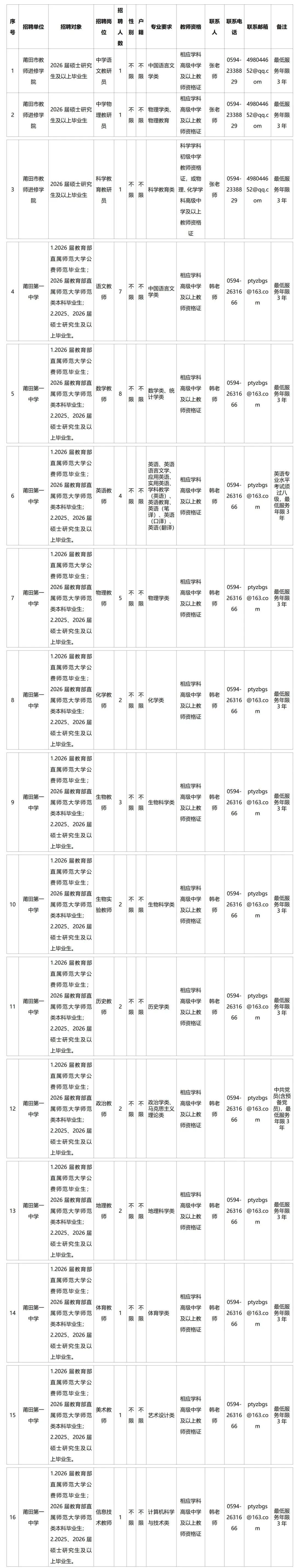 莆田市市直学校公开招聘2026年新任教师方案