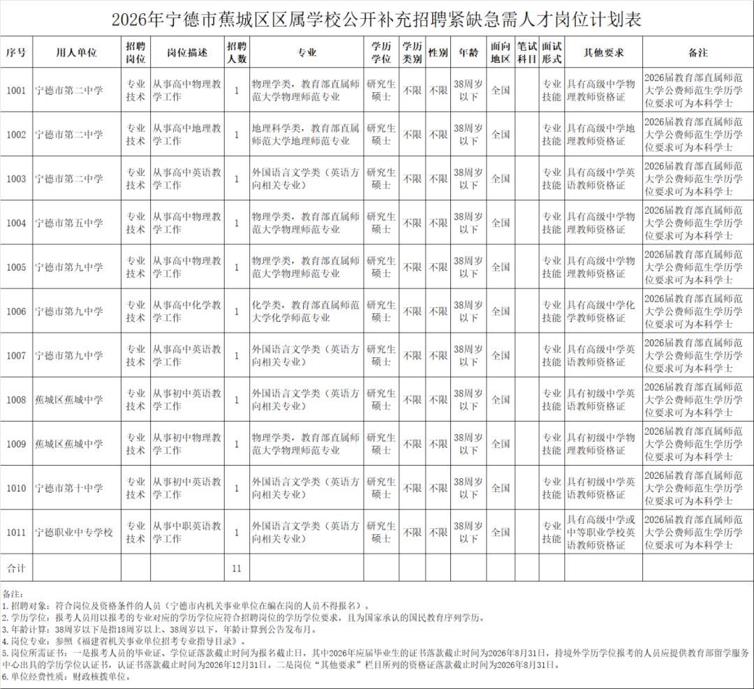 宁德市蕉城区教育局所属学校公开补充招聘紧缺急需人才11名