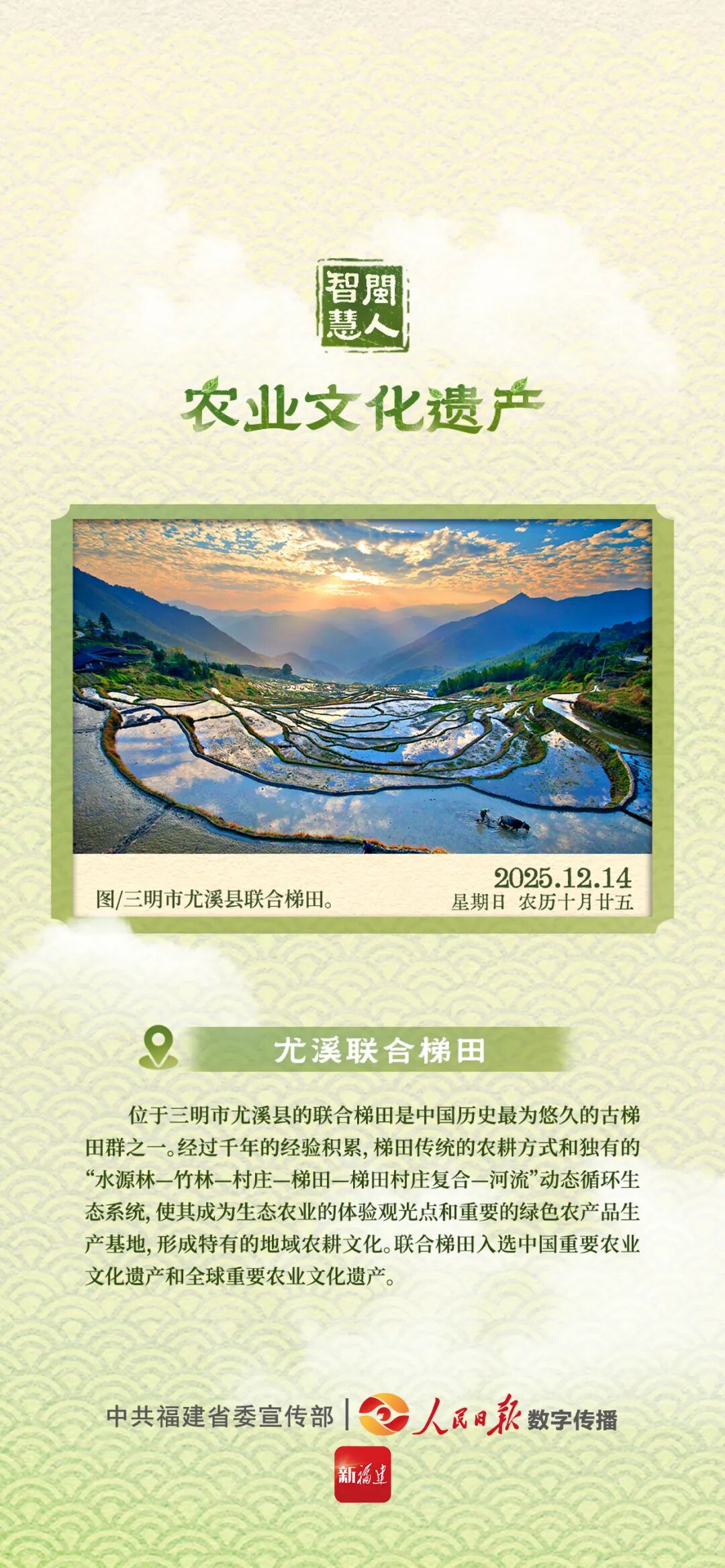 位于三明市尤溪县的联合梯田是中国历史最为悠久的古梯田群之一。经过千年的经验积累,梯田传统的农耕方式和独有的“水源林—竹林—村庄—梯田—梯田村庄复合—河流”动态循环生态系统,使其成为生态农业的体验观光点和重要的绿色农产品生产基地,形成特有的地域农耕文化。联合梯田入选中国重要农业文化遗产和全球重要农业文化遗产。