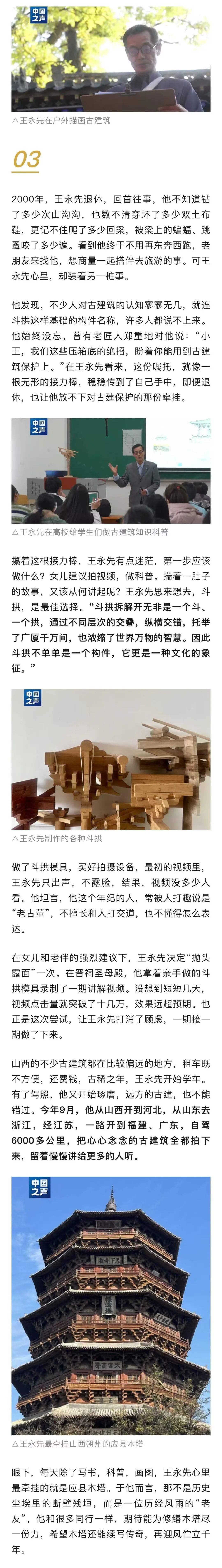 镜头前的王永先,身着蓝色中山装,看起来很清瘦,戴着一副黑框眼镜,不急不慢地讲着他眼里的古建之美。两年半的时间,不仅拥有200多万粉丝的关注,还收获了“斗拱爷爷”的称呼,75岁的王永先至今觉得意外。