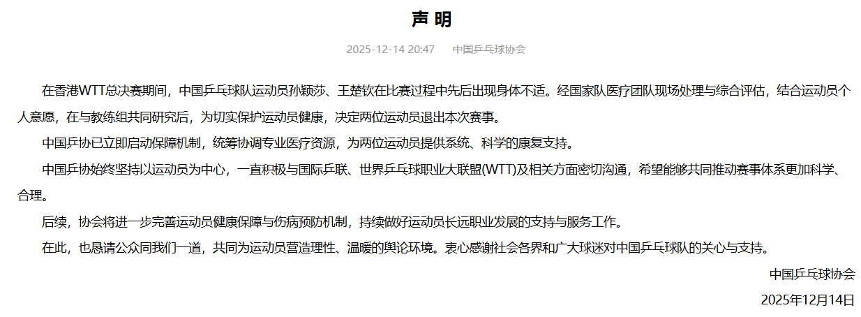 新华社北京12月14日电 中国乒乓球协会14日在官网发布声明,对国乒队员孙颖莎、王楚钦在世界乒乓球职业大联盟(WTT)香港总决赛期间因身体不适退赛作出回应,表示将进一步完善运动员健康保障与伤病预防机制,持续做好运动员长远职业发展的支持与服务工作。