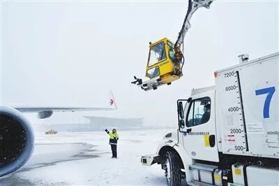 图为 12月12日,武宿国际机场,东航山西分公司工作人员操作除冰车为航空器大翼除冰。