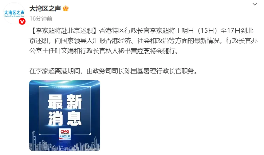 12月14日,据大湾区之声:香港特区行政长官李家超将于明日(15日)至17日到北京述职,向国家领导人汇报香港经济、社会和政治等方面的最新情况。行政长官办公室主任叶文娟和行政长官私人秘书黄霆芝将会随行。