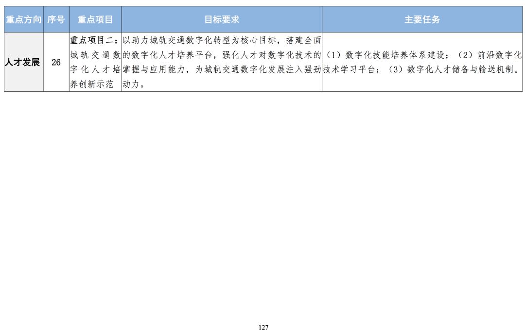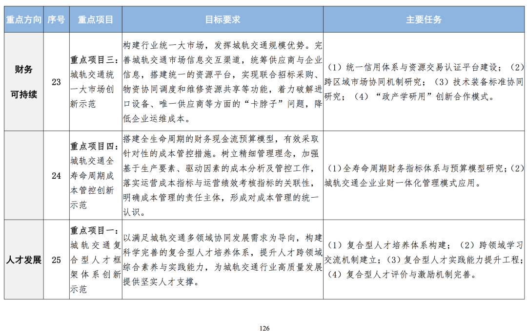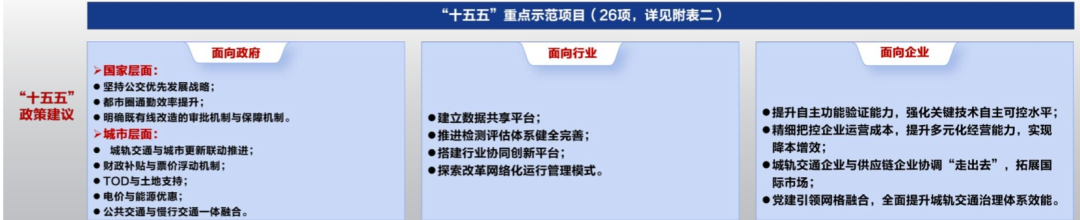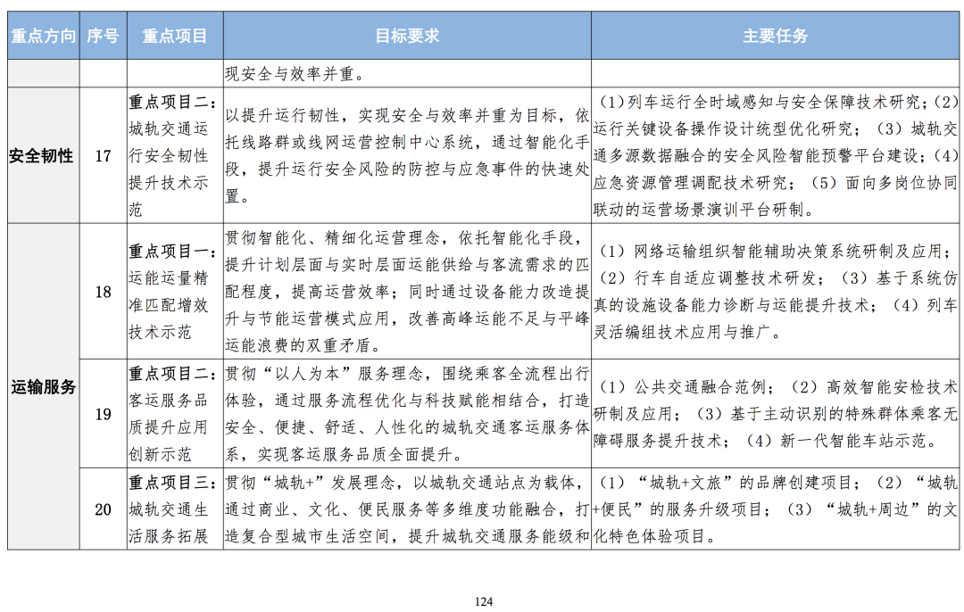 中国城市轨道交通协会近日发布《“十五五”城市轨道交通发展思路研究》,文件提出“十五五”重点示范项目,涵盖智慧赋能、绿色低碳、统筹融合、技术创新、安全韧性、运输服务、财务可持续与人才发展八大方向共26个项目,旨在推动城轨交通高质量、数智化、绿色化、一体化发展,全面提升行业自主可控能力与全球竞争力。