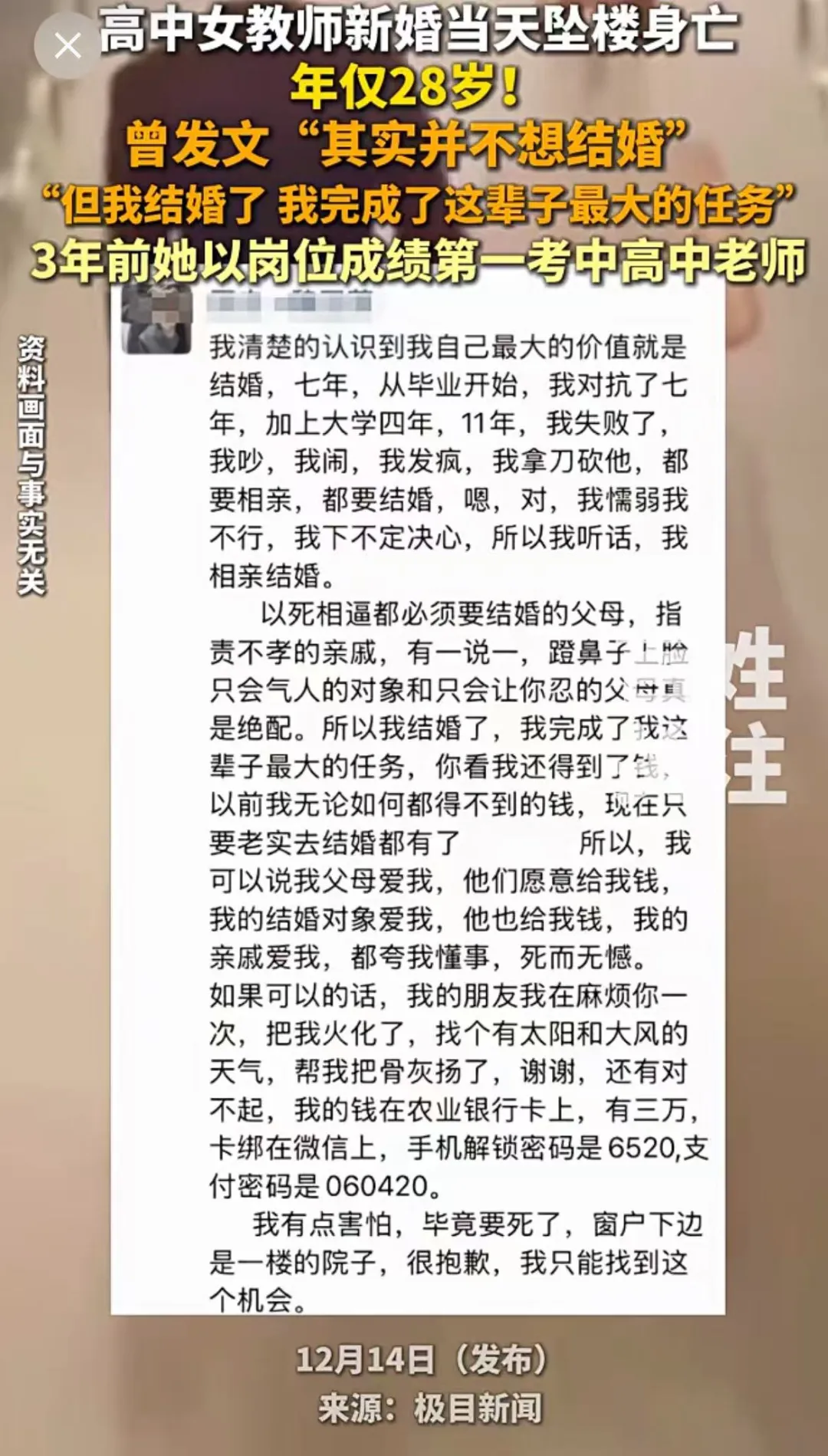 12月10日,河南鲁山县一名28岁高中女教师于新婚当天,从某小区7楼坠楼身亡。事发后,其所在学校及同学证实了她的教师身份。另有消息称,该女子生前曾在朋友圈表示“其实并不想结婚”。