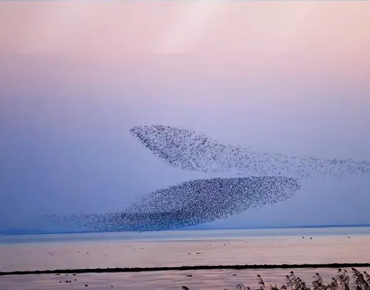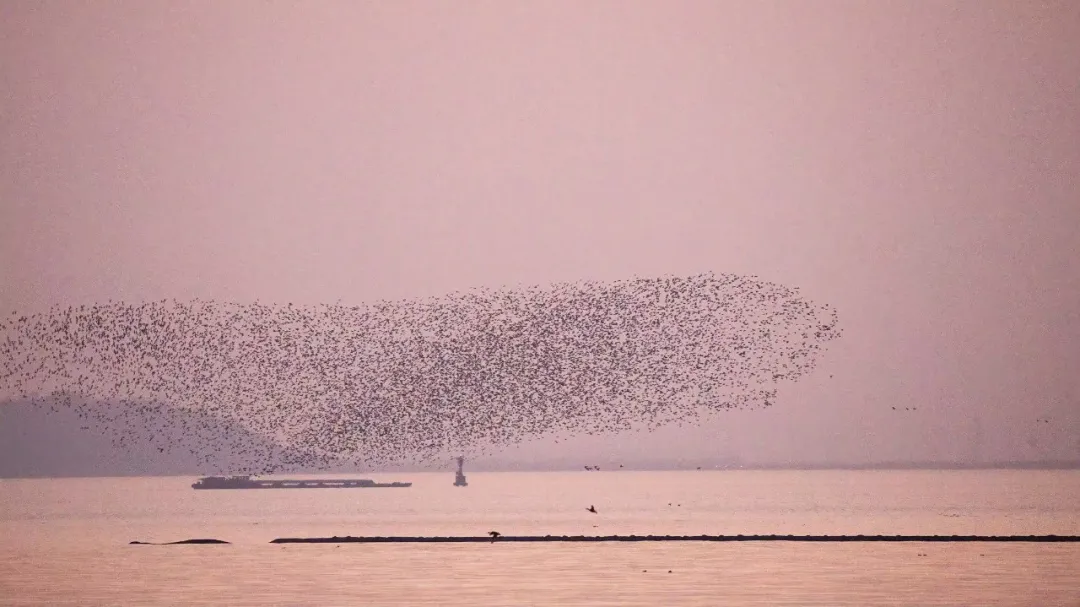 2025年2月4日傍晚,张忠东在巢湖桂花台,拍摄下“鸟浪”奇景,绵延几公里的花脸鸭“鸟浪”仿佛一只巨大的鲸鱼飞向天空,好像电影《大鱼海棠》中的壮观景象真实上演。