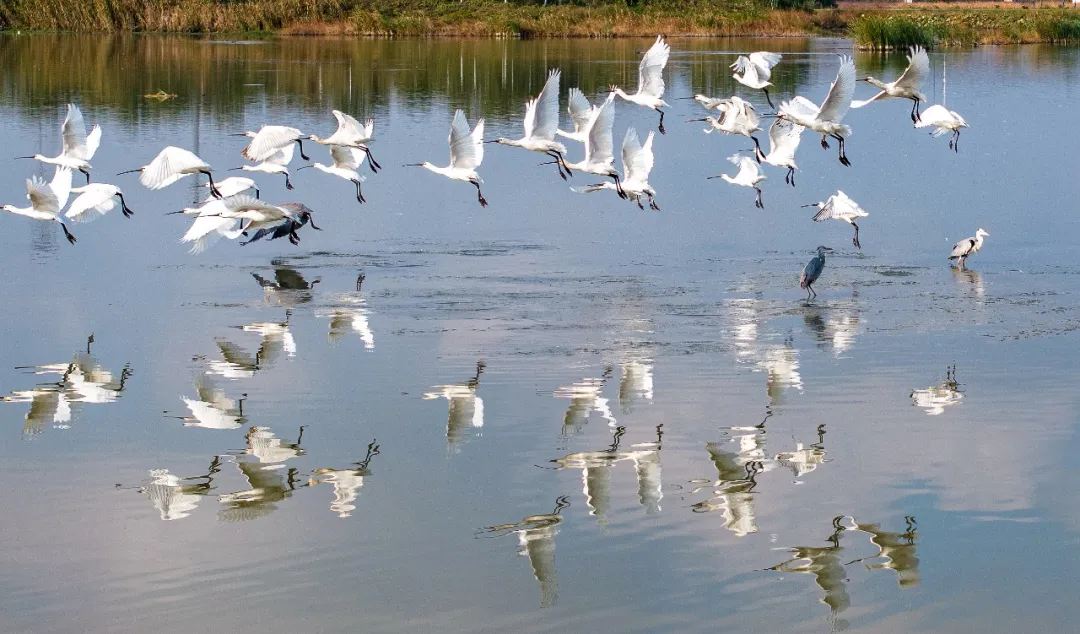 什么季节在什么位置观鸟最好,张忠东心中有数,桂花台、白马山、四顶山,都是他常驻的据点。而此刻,十八联圩湿地正聚集着成群的候鸟。我们沿着南淝河梅龙坝,走进梅南的湿地深处。东方白鹳优雅地踱步,卷羽鹈鹕成群游弋,白鹤展翅高飞,黑翅长脚鹬在水边轻巧觅食,小䴙䴘则像水中的精灵,时隐时现。