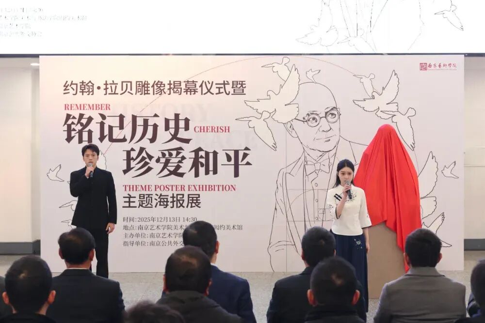 12月13日下午,南京艺术学院在学校闳约美术馆举办约翰·拉贝雕像揭幕仪式暨“铭记历史 珍爱和平”主题海报展。