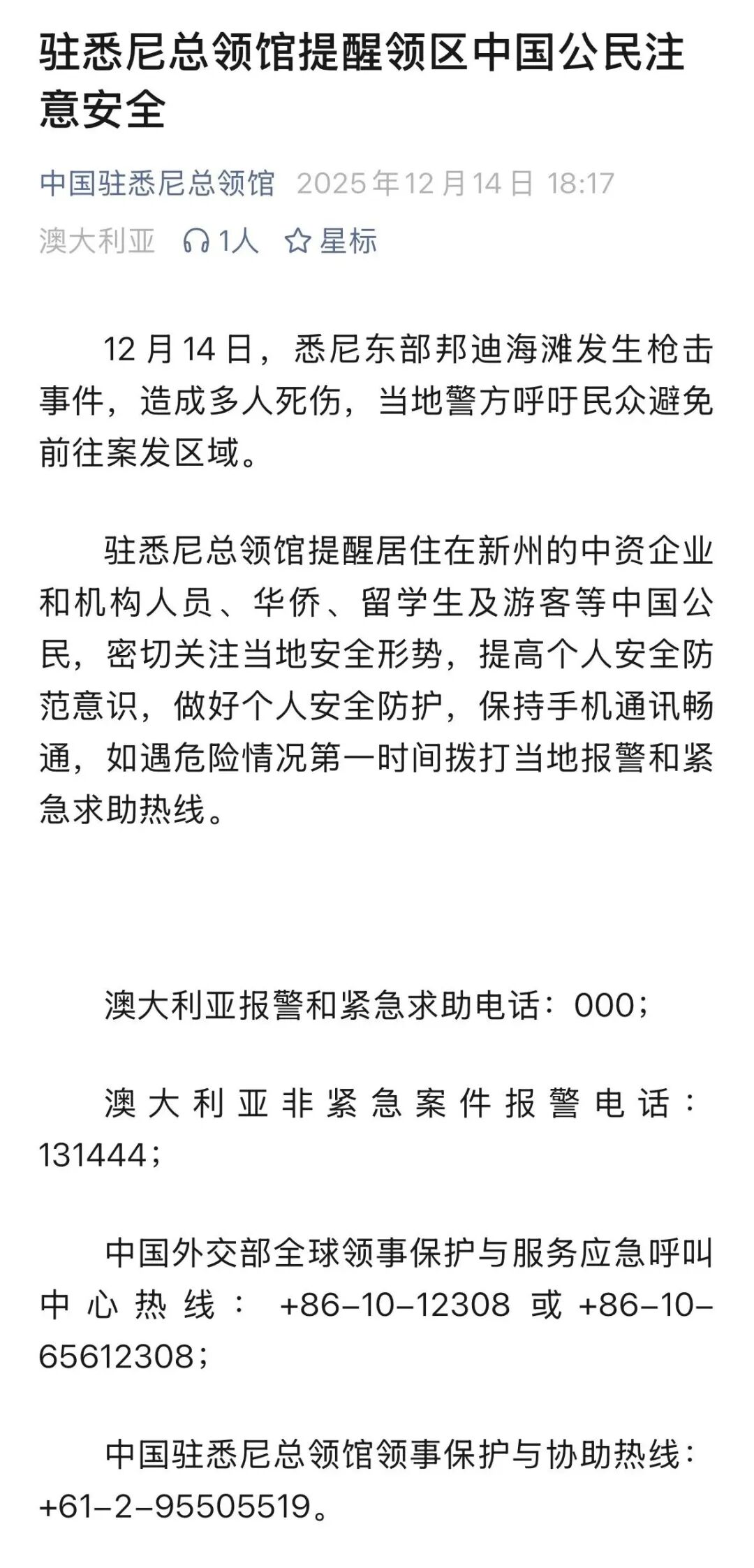 澳大利亚悉尼海滩14日发生枪击事件后,中国驻悉尼总领馆提示领区中国公民注意安全。