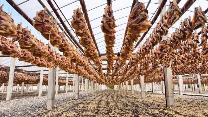 选鸭、宰杀、清洗、腌制、晾晒,一道道工序环环相扣,缺一不可。清洗干净的鸭子,需用粗盐反复搓揉,让咸味慢慢渗入肌理。腌制7至10天的时间里,中间要翻缸2至3次,确保每一寸鸭肉都入味均匀。腌好的鸭子褪去盐霜,便要挂在通风向阳处晾晒7天,其间,还要严防淋雨受潮,直到鸭身脱水紧实、色泽鲜亮。