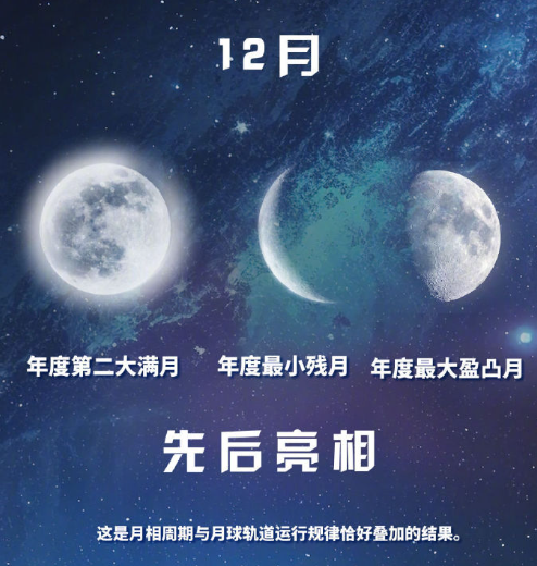 5、16日将迎来本年度最小残月 届时,月球位于轨道远地点附近,人们看到的月亮像是一弯纤细的银钩。12月5日,也被称为“超级月亮”的本年度第二大满月刚刚出现;而就在年度最小残月现身后的15天,本年度最大盈凸月也将于31日亮相天宇。(@新华社)