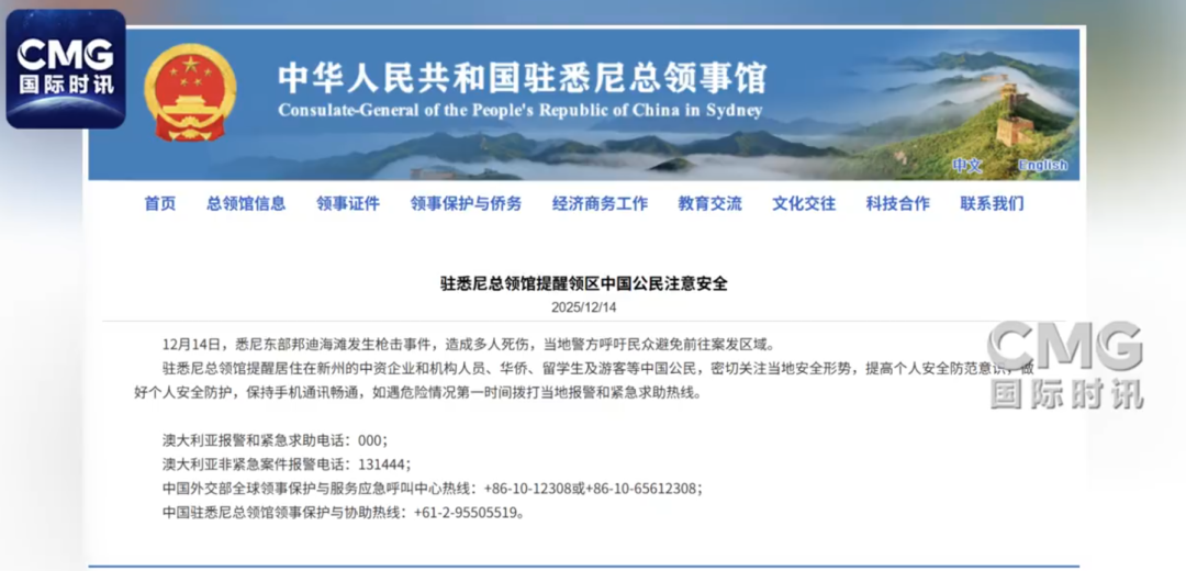 1、我驻悉尼总领馆提醒中国公民注意安全 14日,悉尼东部邦迪海滩发生枪击事件,造成多人死伤。中国驻悉尼总领馆提醒居住在新州的中资企业和机构人员、华侨、留学生及游客等中国公民,密切关注当地安全形势,如遇危险情况第一时间拨打当地报警和紧急求助热线。(@央视新闻)
