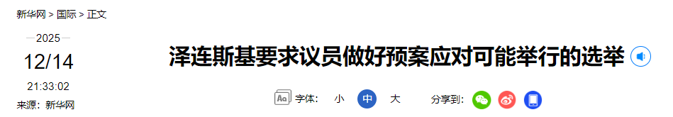 据乌克兰国家通讯社14日报道,乌克兰总统泽连斯基当天向媒体表示,已告知乌最高拉达(议会)的议员们做好应对不久后可能举行选举的预案。