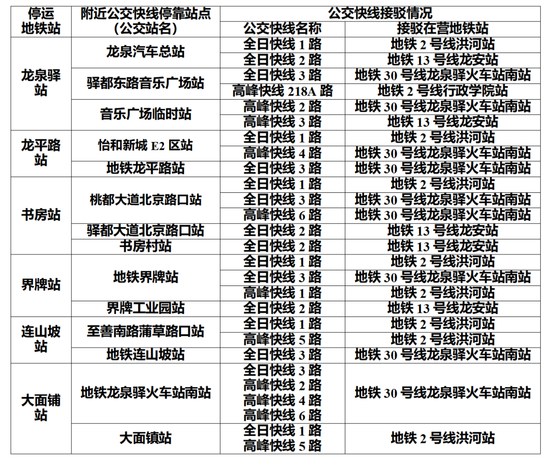 目前,每个停运地铁站周边区域均开行了多条公交快线接驳至运营地铁站,龙泉驿片区市民可选择就近乘车。成都公交后续将持续密切关注客流出行特征,结合实际需求动态调整线路发车频次、线路走向、停靠站点等。