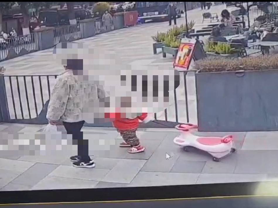 这起案件,随着一段现场监控视频的公开,引发了热议。记者获取到的视频显示,睿睿拉着扭扭车在人行道行走,而王涛此时正打算从扭扭车上跨过去,但不慎踩中扭扭车的尾部,直接一个踉跄、摔倒后受伤。