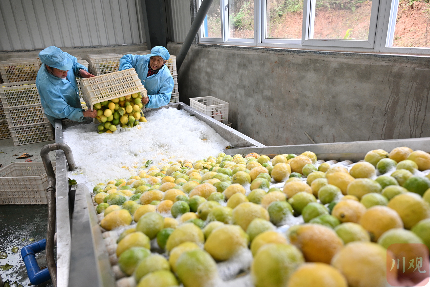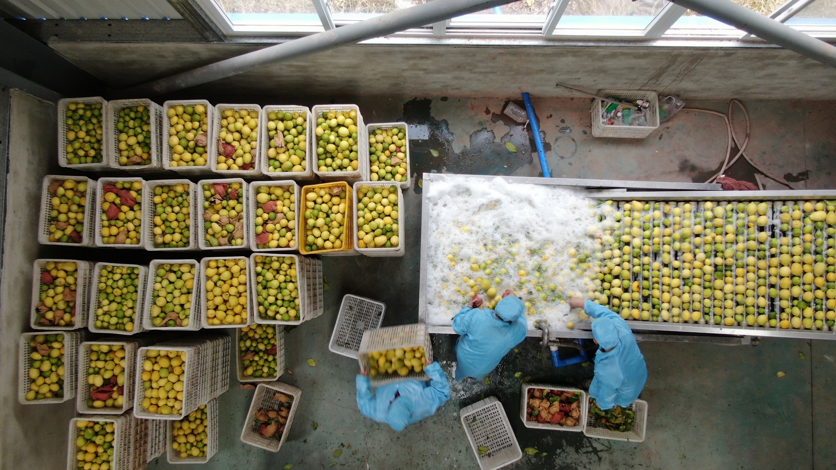 工人们清洗柠檬。