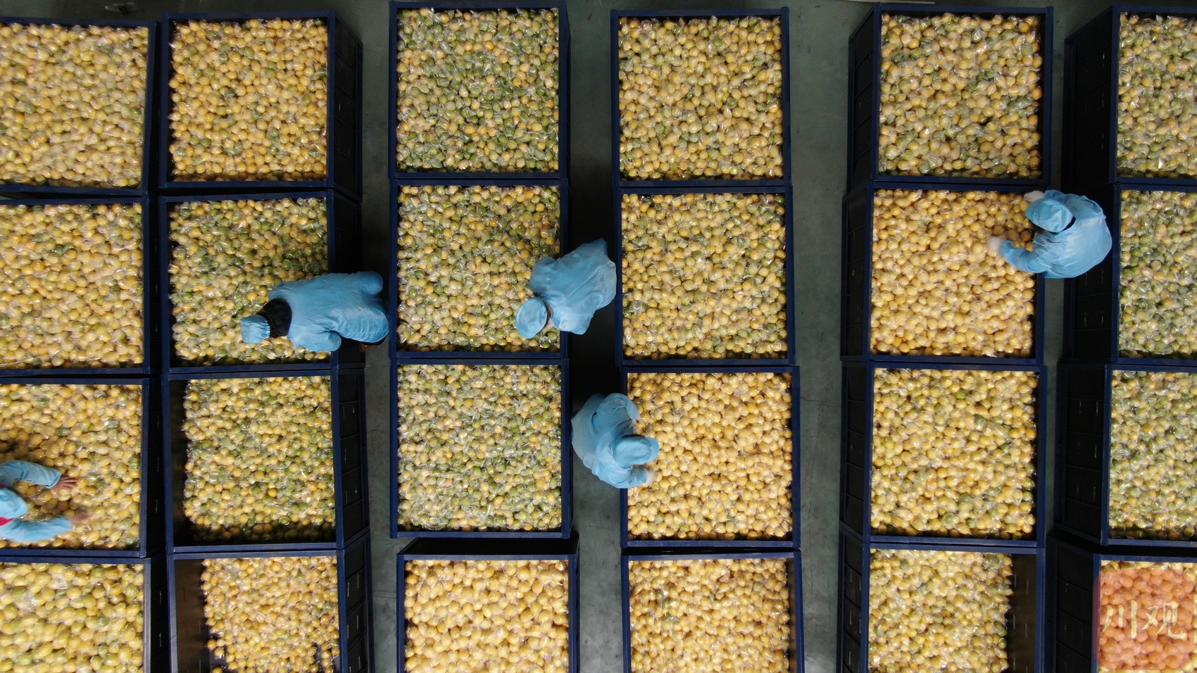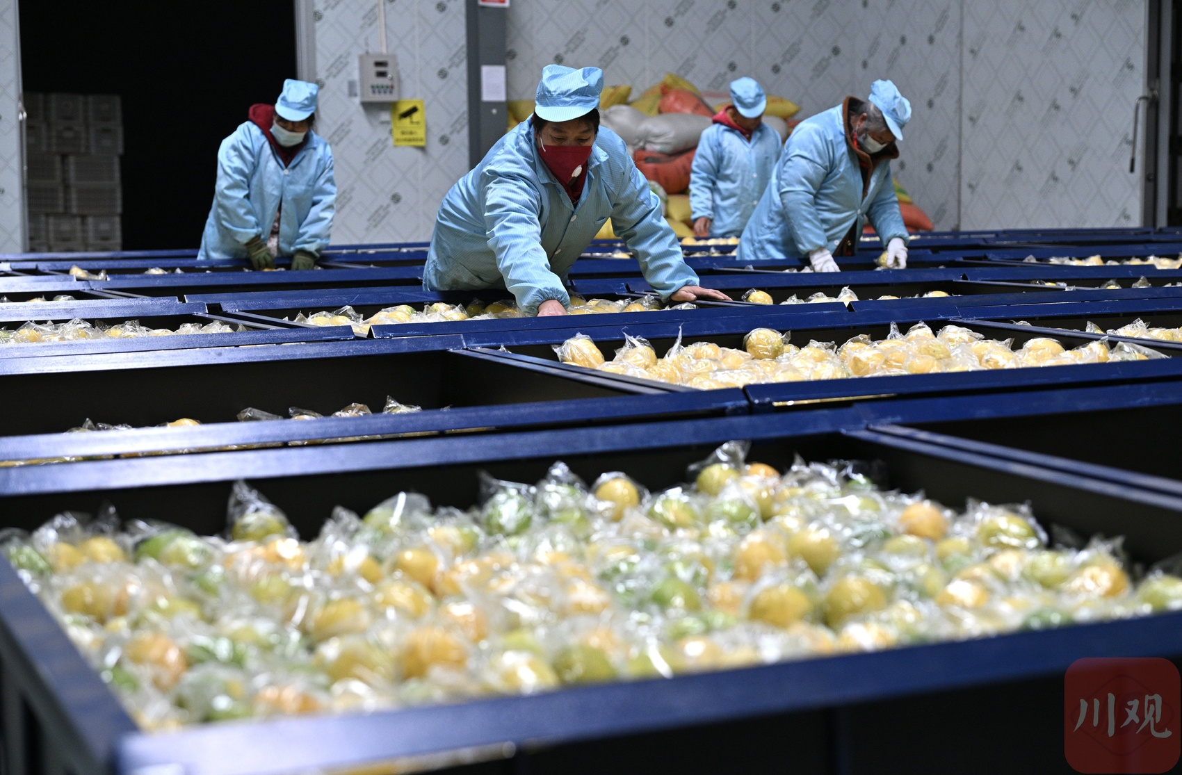 工人将清洗后的柠檬装框。