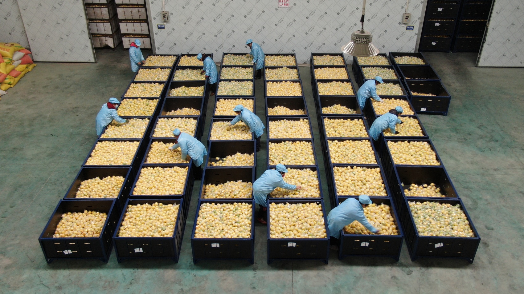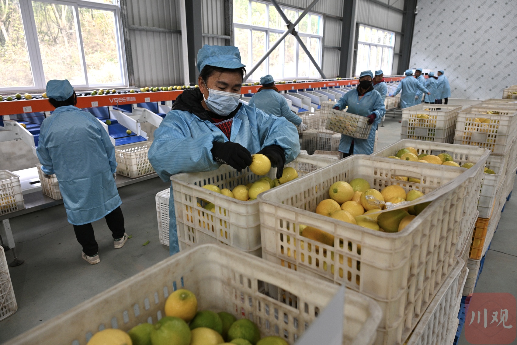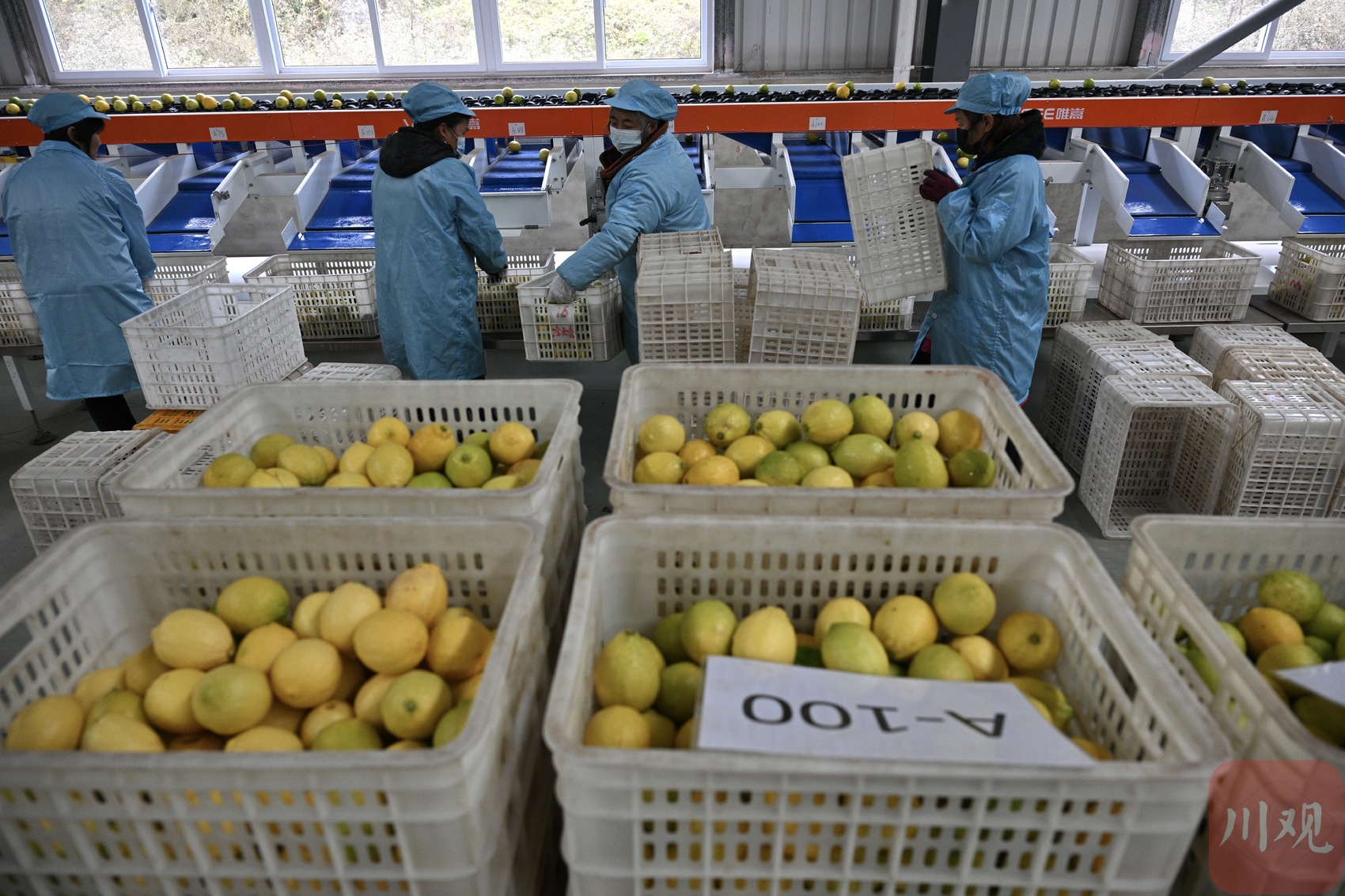 工人分拣柠檬,准备装箱。