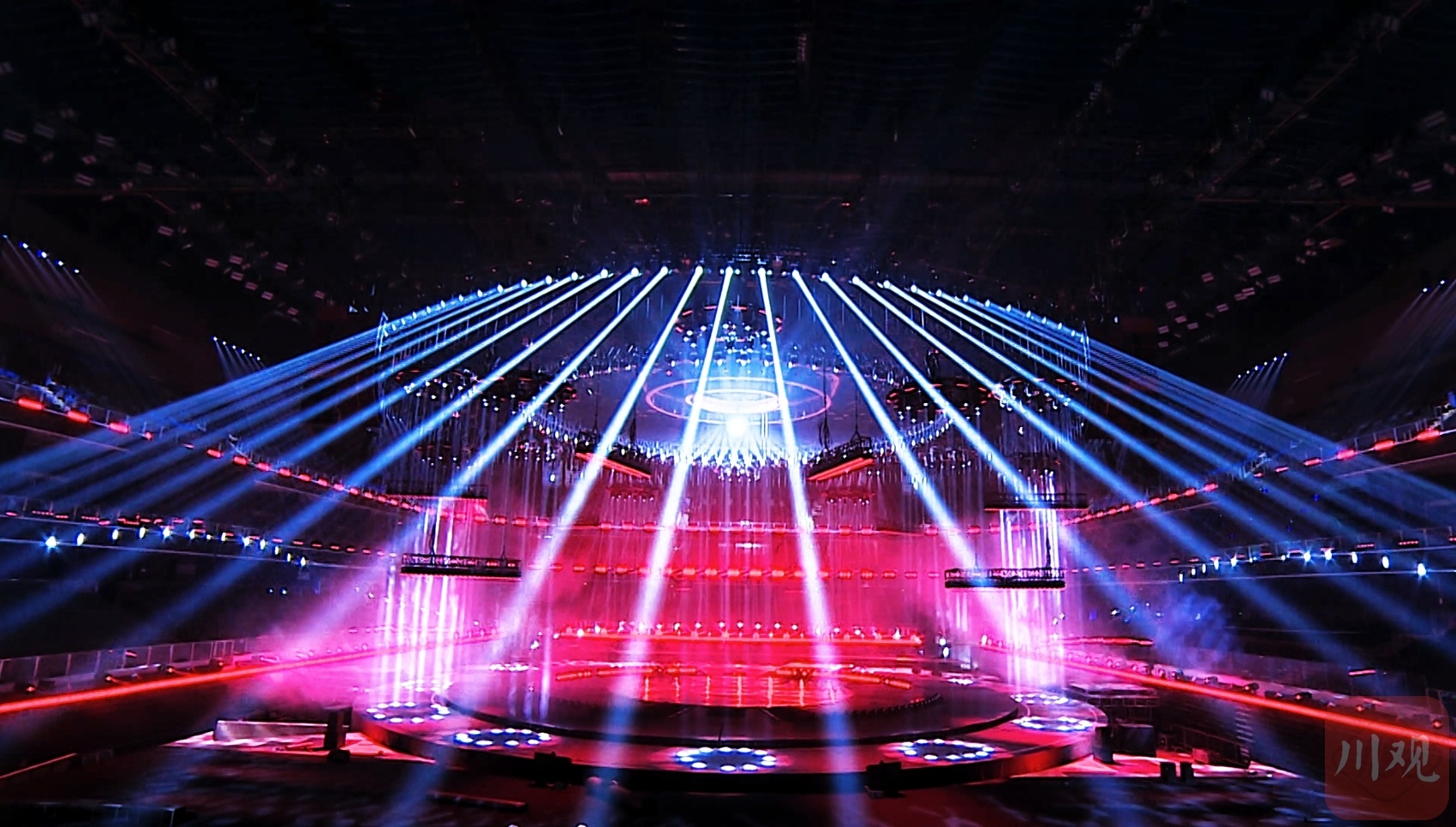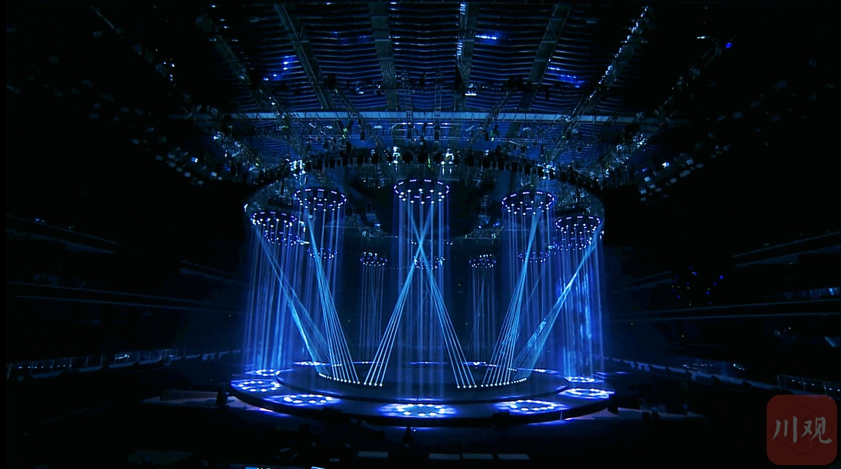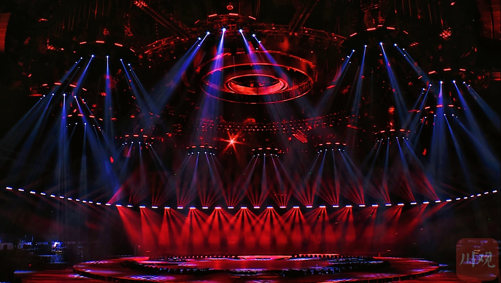 晚会舞台采用6圆环四面舞台设计