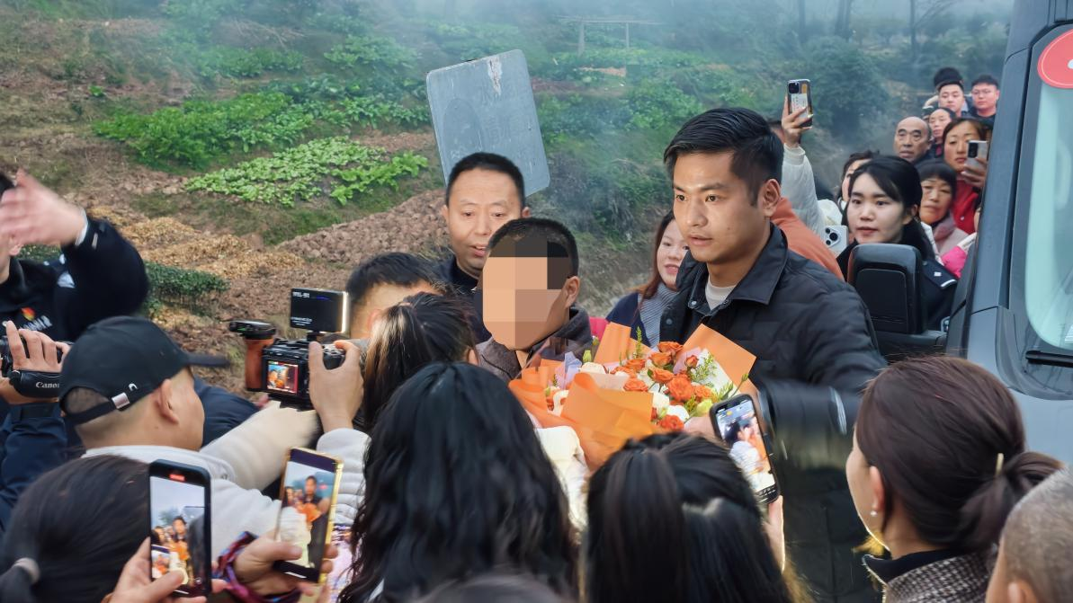 回家的车在高速上飞驰,禧年话不多,只是望着窗外飞速倒退的风景。当车辆驶入百丈镇,道路两旁站满了自发迎接的乡亲,笑容、掌声、欢呼声如潮水般涌来,名山公安交警在道路上维护秩序,见证着这团圆的一幕。