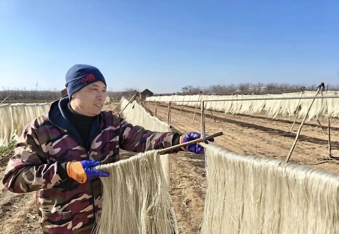 “我们上周就开始加工粉条了,得抓紧晴天晾干,然后入库储存。”在晾晒场上,51岁的青岛金粉世家红薯专业合作社理事长相武一边忙活一边向记者介绍。每年大雪节气前后,家里便着手制作粉条。他从小就给父亲打下手,对制作流程熟记于心。