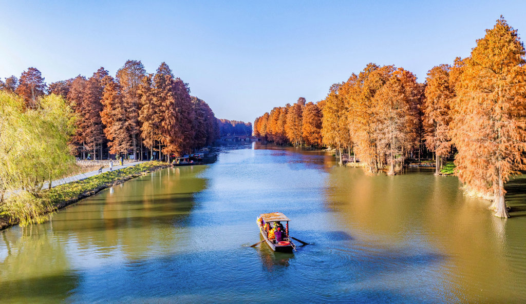 15日,游客在江苏兴化里下河国家湿地公园赏景游玩(无人机照片)。