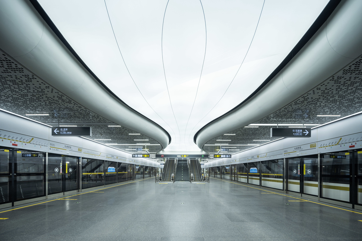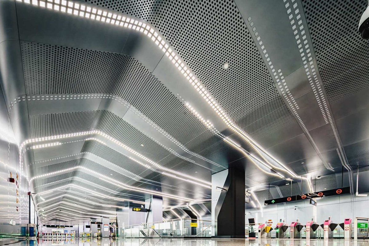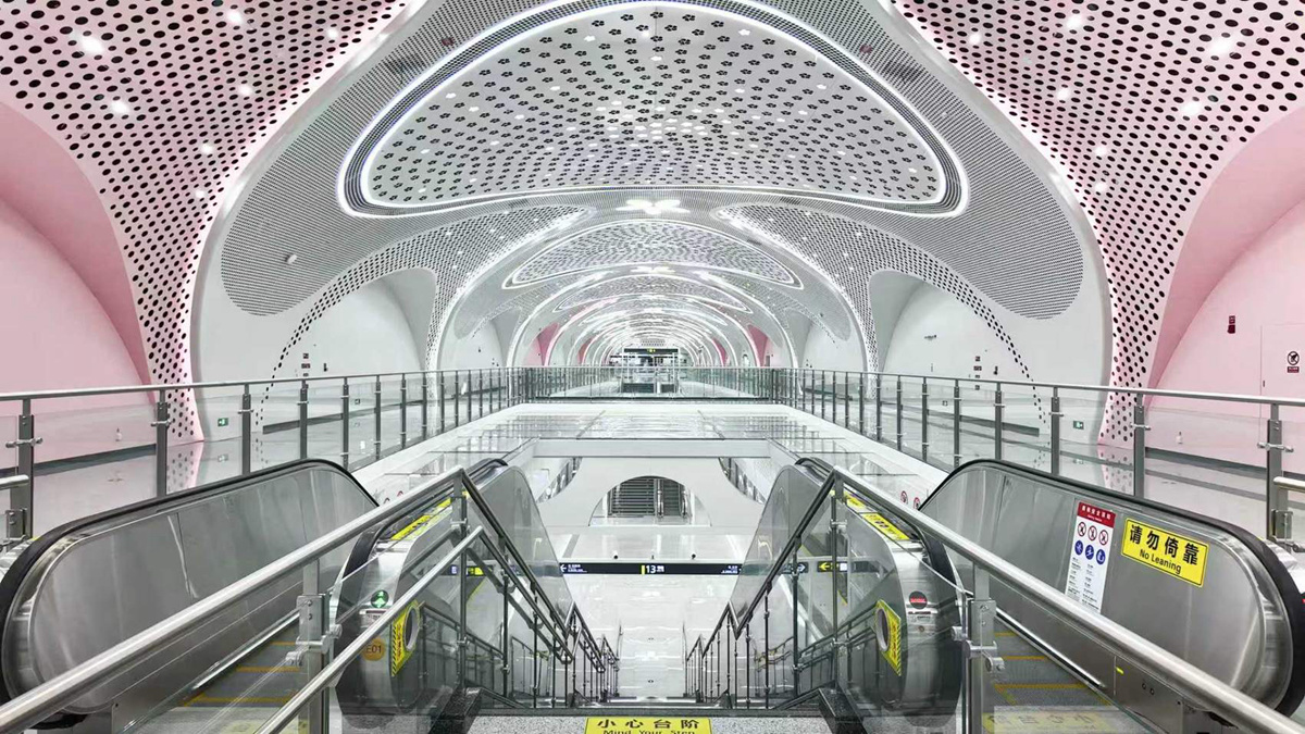 在重点艺术站金融城北站,天花板上条状灯光如代码般延伸,让人仿佛置身于科幻电影的场景中。王明霞介绍,站厅设计灵感源于数据洪流,既体现了金融行业的严谨特质,又展现了数字时代的流动美感。