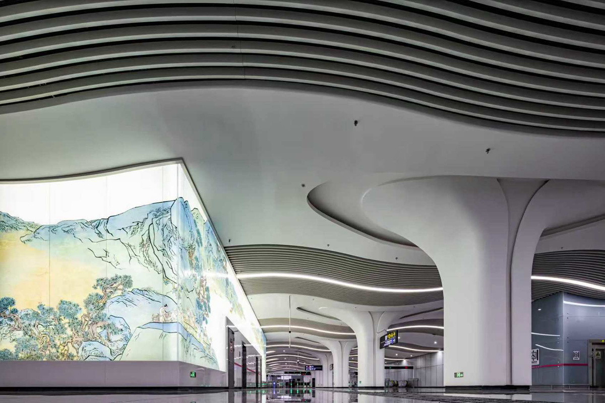 走进杜甫草堂站,仿佛走进诗歌的世界。作为全线唯一的城市级重点站,该站采用“空间、艺术、文化一体化”手法,将草堂标志性的溪水、院墙、竹篱、茅屋等元素巧妙融入空间肌理。记者看到,开阔的站厅放大了空间通透感,天花板两端用蜿蜒的线条勾勒出溪水的流线。当灯光亮起时,似月光洒在浣花溪上,朦胧诗意扑面而来。