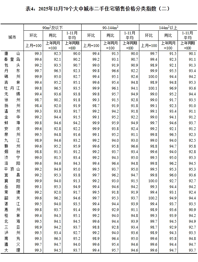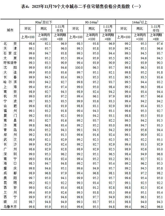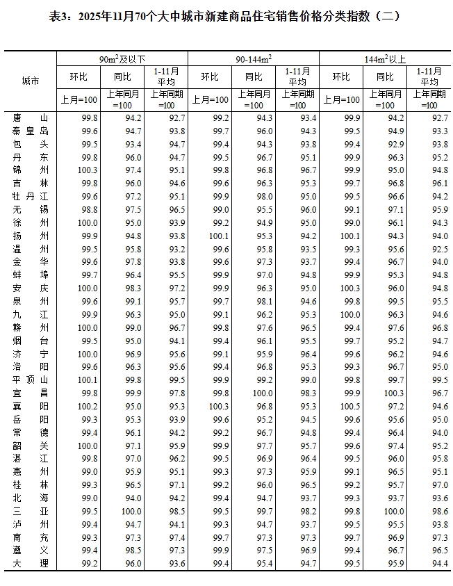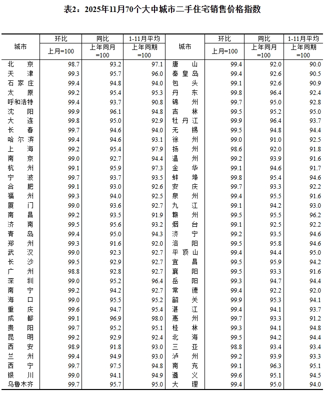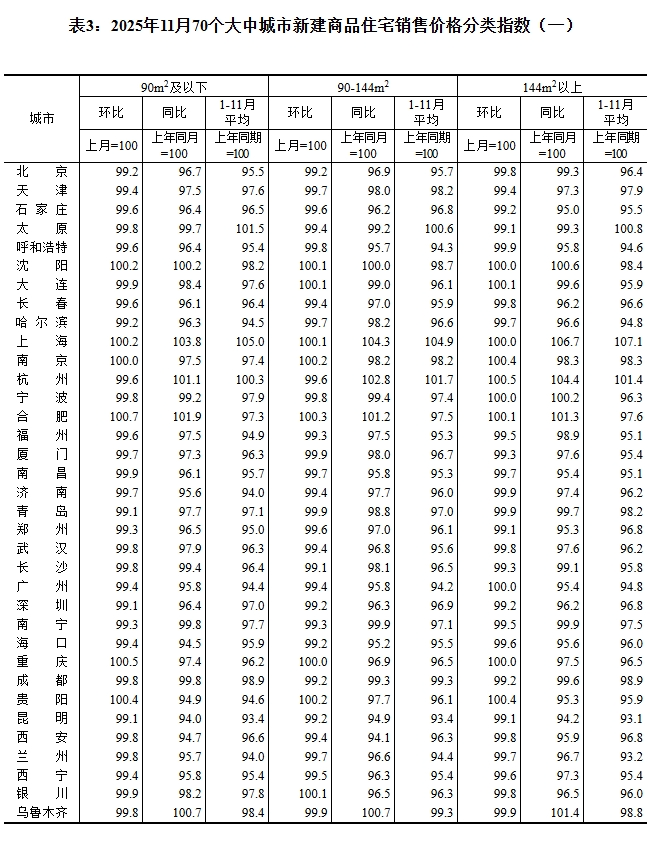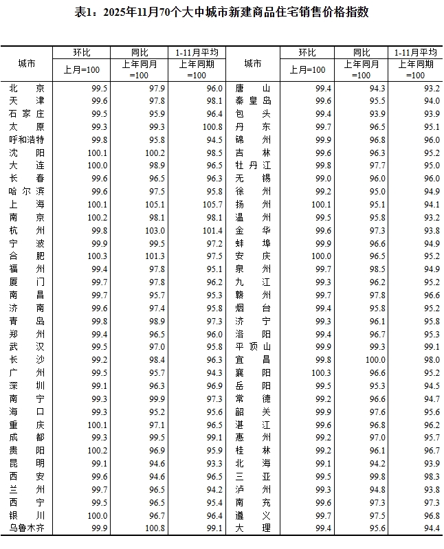 国家统计局今日发布2025年11月份70个大中城市商品住宅销售价格变动情况。