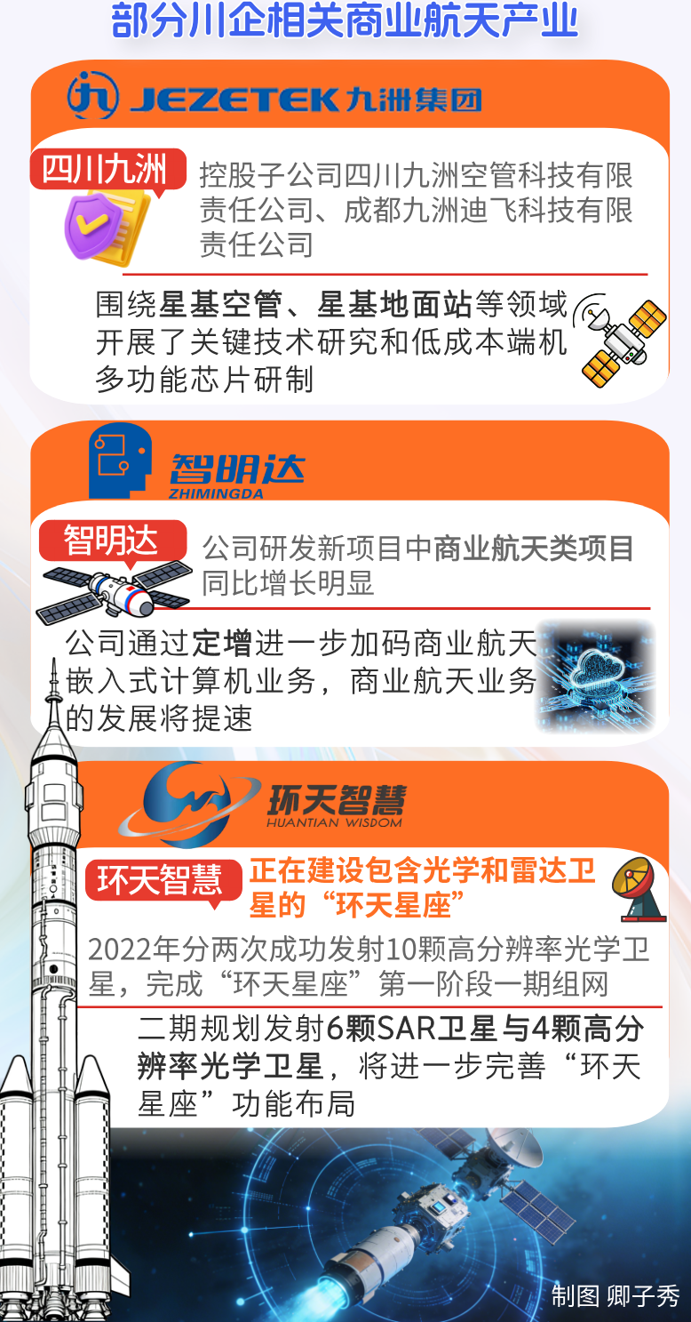 金融投资报记者注意到,四川九洲(000801.SZ)控股子公司四川九洲空管科技有限责任公司(以下简称“九洲空管”)、成都九洲迪飞科技有限责任公司紧跟国家航空和航天相关政策,结合行业规划,围绕星基空管、星基地面站等领域开展了关键技术研究和低成本端机多功能芯片研制。值得一提的是,九洲空管积极探索基于低轨卫星星座的空管监视技术,星基ADS-B载荷已搭载“空事卫星一号”在轨验证,具有较好的技术基础。目前,九洲空管正积极跟踪“航空+商业航天”相关政策,并结合行业规划,积极推动产业应用。智明达(688636.SH)则进一步加码商业航天嵌入式计算机业务。根据公司之前发布的定增预案,募集资金将主要投向无人装备及商业航天嵌入式计算机研发及产业化建设项目。该项目实施后,将有效提高和增强公司在国家重点领域使用嵌入式计算机产品的研发、生产能力和产品质量;同时,项目产线的智能制造水平和公司的信息化管理水平也将同步大幅提升。从业务层面上看,公司在稳固和加强传统优势领域的情况下,加强了对低空经济和商业卫星相关系统和产业的配套拓展。在公司的新研发项目中,商业航天类项目同比增长明显。此次募投项目的实施,公司的无人装备业务和商业航天业务的发展将提速。作为非上市川企的代表,环天智慧科技股份有限公司(以下简称“环天智慧”)是四川商业航天领域的核心企业之一,公司正在建设包含光学和雷达卫星的“环天星座”。公开信息显示,“环天星座”作为西南地区首个自主可控的商业遥感卫星星座,2022年曾两次成功发射10颗高分辨率光学卫星,完成“环天星座”第一阶段第一期组网。第二期规划发射6颗SAR卫星与4颗高分辨率光学卫星,将进一步完善“环天星座”功能布局。