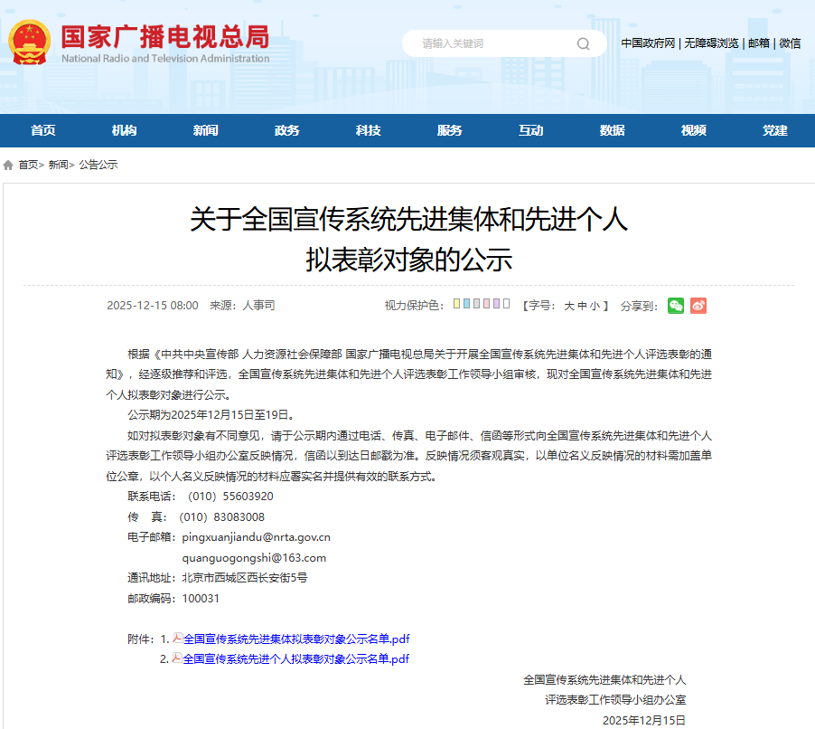 今天(12月15日),国家广播电视总局官网发布《关于全国宣传系统先进集体和先进个人拟表彰对象的公示》。