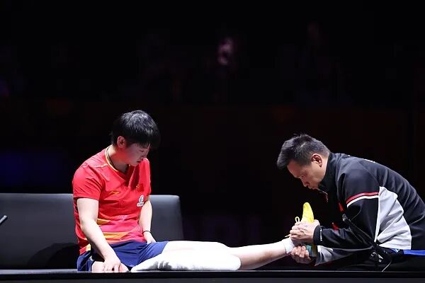 第三局的一个腾空动作后,孙颖莎露出了痛苦的表情。局间,队医紧忙上前用运动绑带捆扎了她的左脚踝,看台上的观众也在不断高呼“健康第一、健康完赛”。